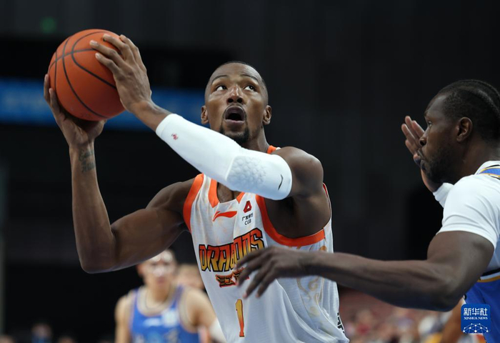 1月13日,江苏肯帝亚队球员亨特(前)在比赛中上篮。