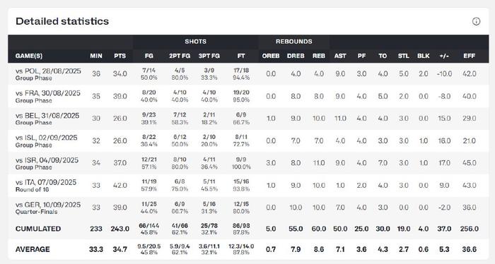 东契奇本次欧洲杯场均33.3分钟,拿到34.7分8.6篮板7.1助攻2.7抢断0.6盖帽,命中率45.8%,三分命中率32.1%,得分、助攻、篮板、抢断、盖帽、效率都是斯洛文尼亚第一,其中得分、效率是欧洲杯第一。