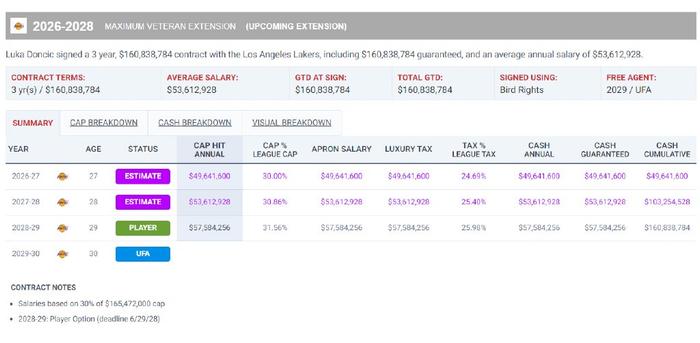 在东契奇欧洲杯出局后,洛杉矶湖人队必然成为最大的赢家,东契奇今夏与湖人签下三年1.65亿的提前续约顶薪,而这1.65亿只有1.608亿是全额保障,因为1.65亿是基于递增的工资帽 ,如果工资帽没有逐年递增那么这份顶薪最终就是三年1.608亿。如此超巨长留湖人,还不是塔图姆、布朗那种动则6000-7000万的均薪,何尝不是一种大胜?