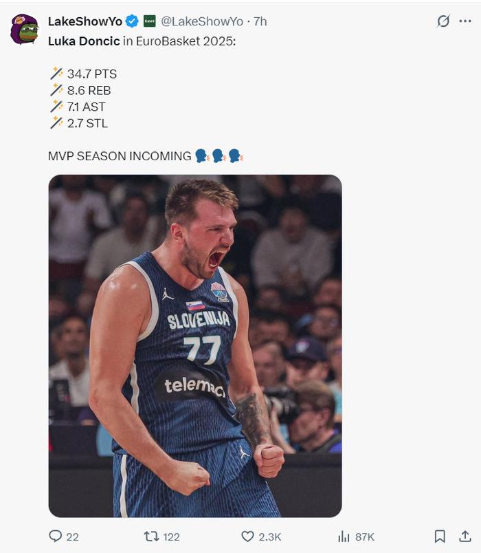 湖人媒体晒出东契奇的数据后写道:MVP赛季即将到来!东契奇能在湖人拿MVP那表会继续增加湖人的曝光度、流量、市值,湖人肯定才是最终的赢家啊。