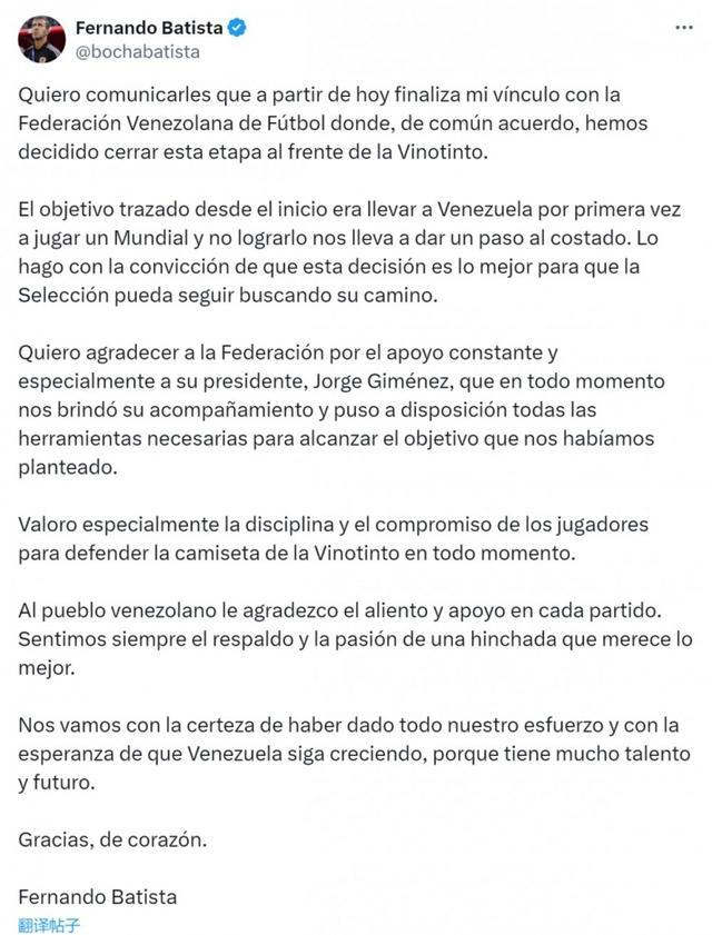 直播吧9月11日讯 委内瑞拉南美世预赛未能出线,主帅费尔南多-巴蒂斯塔离任,巴蒂斯塔社媒发文告别。